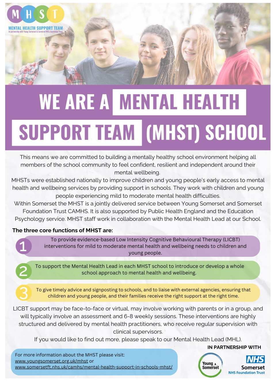 We are a MHST (Mental Health Support Team) school. We work closely with our MHST partners to deliver a wide-range of support for pupils who are experiencing mental health difficulties. More information can be found on the Young Somerset webpage.