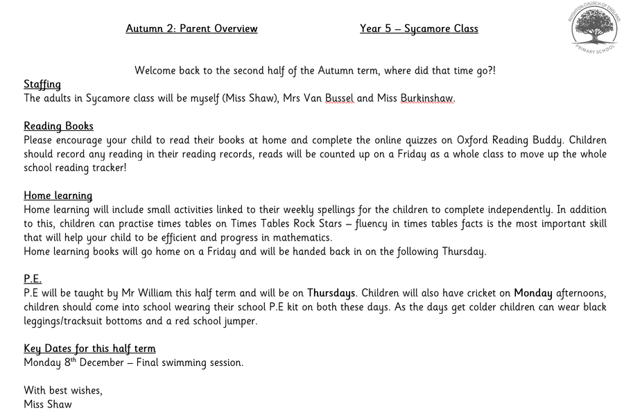 PE will be on Mondays and Thursdays, children should come to school wearing their PE kits.